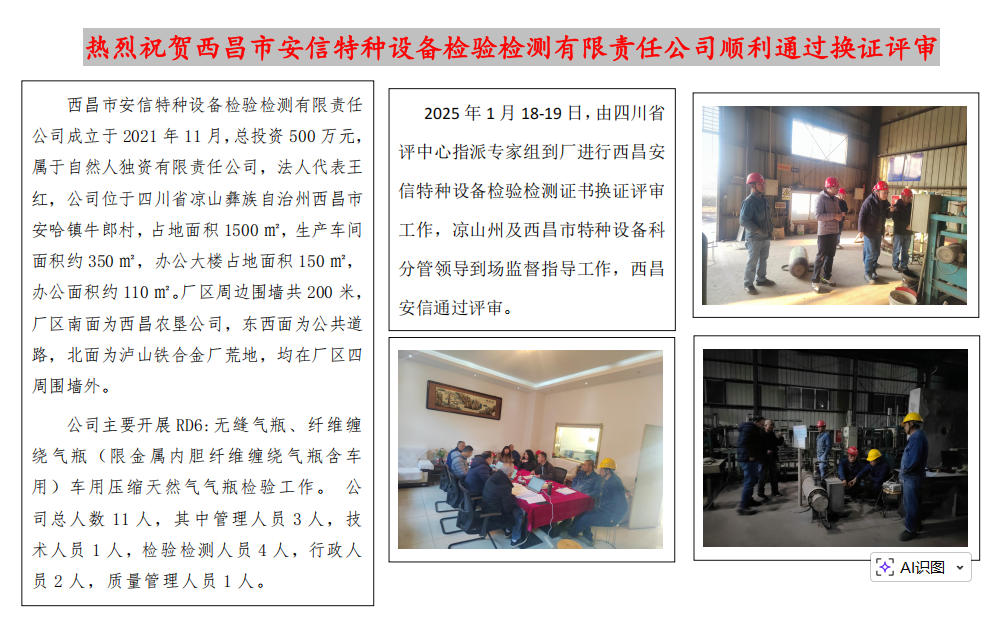 热烈祝贺西昌安信特种设备检验检测公司通过换证评审